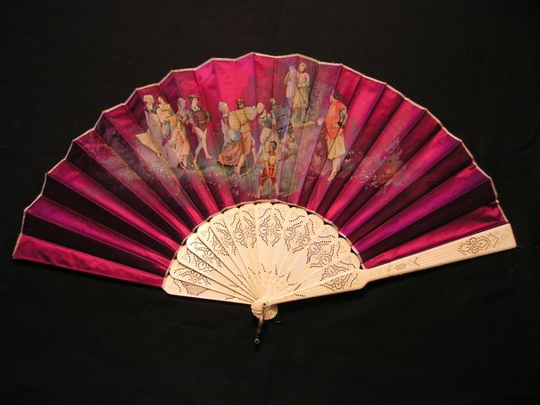 Monture en os grillé et repercé. Feuille en satin de soie grenat. Signature à droite.