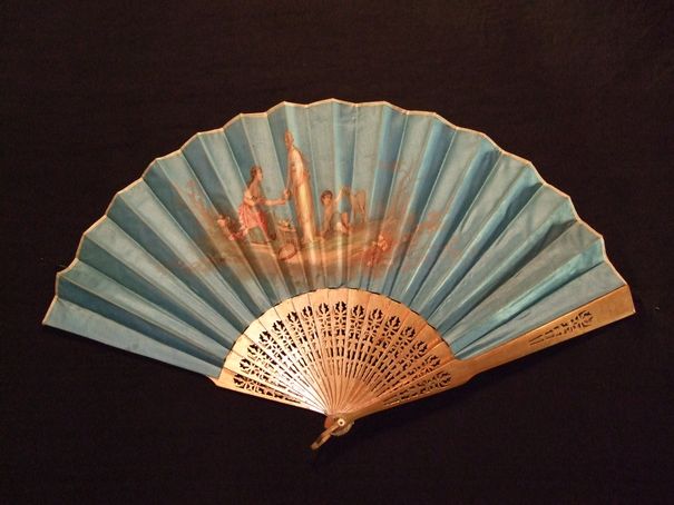 Monture en bois repercé doré. Feuille en satin de soie bleue. Signature à droite.