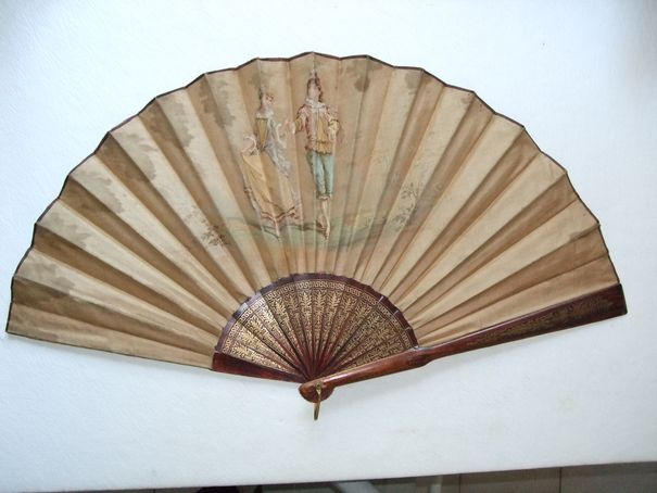 Monture en bois naturel à motifs dorés. feuille en satin de coton. Signature à gauche.