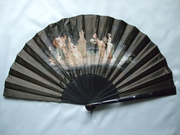 Monture en bois noirci, panaches à motifs de ronces. Feuille en satin noir. Signature à droite sous le fauteuil.