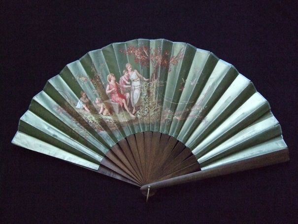 Monture en bois naturel. Feuille en papier mordoré. Signature à gauche.