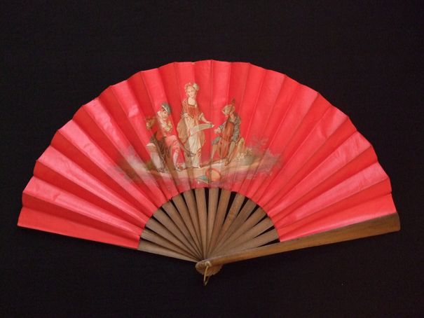 Monture en bois naturel. Feuille en satin de soie rouge. Signature à droite.