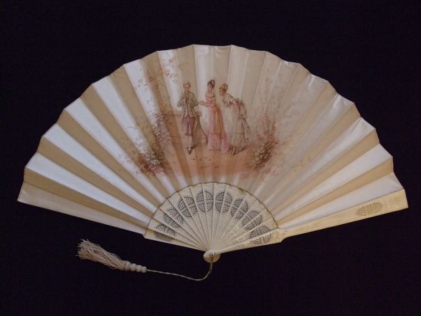 Monture en os repercé. Feuille en satin de soie. Signature à droite.