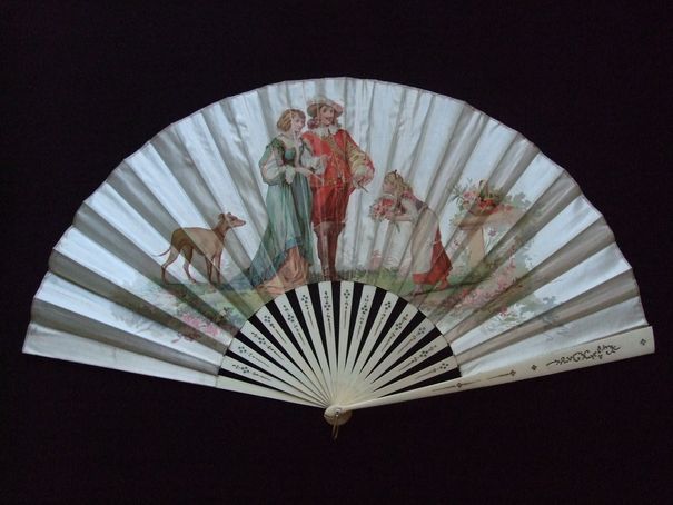 Monture en os gravé et doré. Feuille en satin de soie montée à l'Anglaise. Signature à droite.
