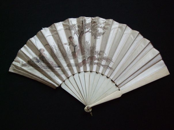 Monture en os lisse. Feuille en satin de coton. Signature à l'extrême gauche.