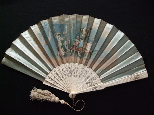 Monture en os repercé et grillé. Feuille en satin de soie vert pâle. Sigantures à droite: A. Lauronce; à gauche: V. Hugot.