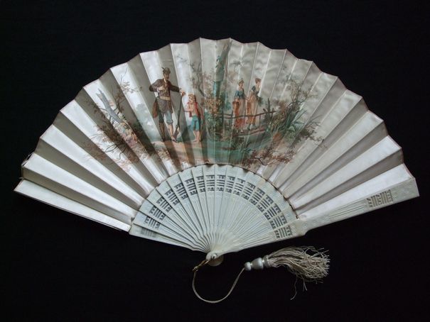 Monture en os gravé et grillé. Feuille en satin de soie. Signature à droite.