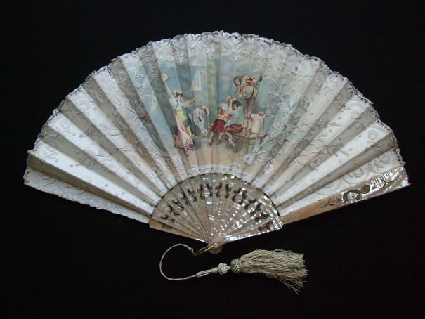 Monture en nacre repercée et dorée. Feuille en satin de soie recouverte de dentelle en application de Bruxelles. Signature à droite.