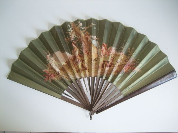 Monture en bois naturel. Feuille en papier mordoré. Signature à gauche.