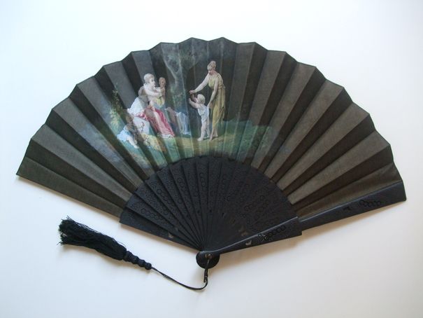 Monture en bois noirci repercé. Feuille en satin de coton noir. Signature à droite.