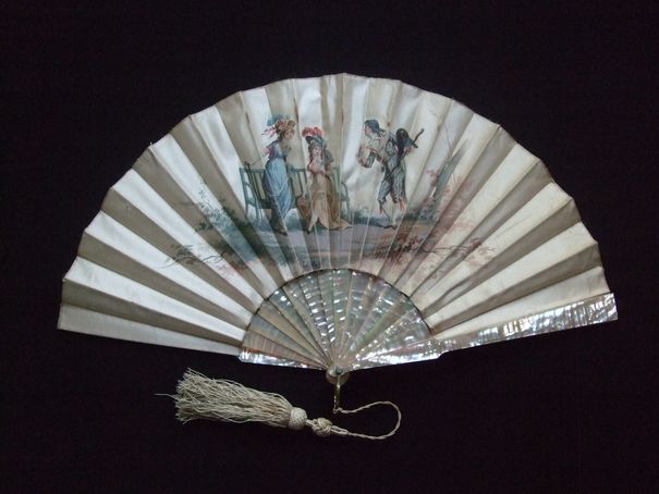 Assises sur un banc, deux élégantes Merveilleuses sont courtisées par un Incroyable.