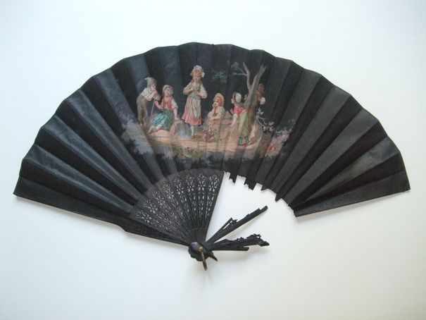 Monture en bois noirci. Feuille double en satin. Signature à droite.