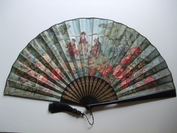 Monture à 18 brins en bois noirci, motifs dorés. Bélière.
